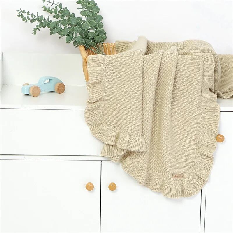 ニットのフリルがかわいらしいブランケットです´-